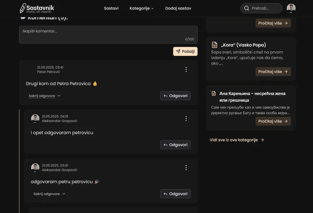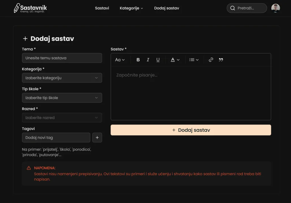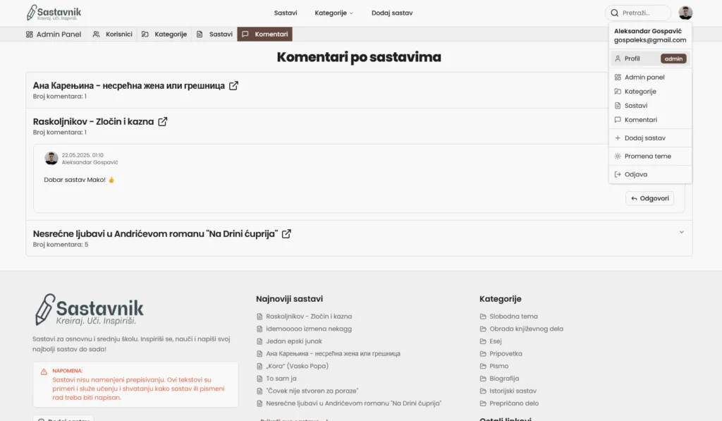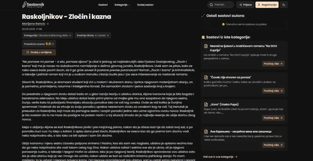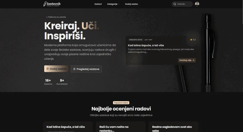 Sastavnik je moderna web platforma koja omogućava učenicima da postavljaju svoje školske sastave, ocenjuju radove drugih, komentarišu i čuvaju omiljene tekstove.